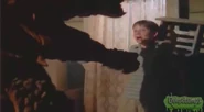 The monster later appears alive in the kitchen doorway. Clark thinks it's going to eat him first since he threw the comic book at its head. Gretchen rightly reasons that the monster will likely eat both of them, since they did try to kill it and all. Gretchen, holding the shovel in both hands, attacks the Swamp monster in the stomach with the tool. The Swamp Monster picks the shovel from her hands and tosses it behind him, back into the kitchen. Gretchen tries to grab the other shovel from the wall of the room, but the Swamp monster spots her movement and grabs that shovel as well, breaking it in two with his hands. Gretchen tells her brother to open that second envelope from the fridge. Before Clark can comply, the Swamp Monster grabs Gretchen's arm and pulls her closer to him, her face now in front of the Swamp Monster's rank alligator-like mouth. Charley the dog runs to the rescue, biting into the Swamp Monster's leg. The Swamp Monster kicks his leg backwards, sending the dog flying across the room back into the kitchen. The Swamp Monster pulls Gretchen's head into his mouth and extends his tongue, covering her entire face with the Swamp Monster's saliva as he licks her body to prepare for eating her. Before the Swamp Monster can close his jaws around Gretchen's head, he stops, removes her from his mouth and asks in English "You human?" Gretchen confirms she is. The Swamp Monster then bellows "I'm allergic to humans!" The Swamp monster dies for real this time.