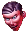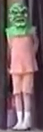 The film's brief appearance retains much of the show's, adding a few features. It further exaggerates the wrinkly grimace with a deeply furrowed brow and crow's feet. The head is larger in proportion and more bulbous, further disconnecting it in appearance from the wearer's own body as a noticeably foreign object. It also adds prominent veins in the forehead, making it appear more fearfully lifelike.
