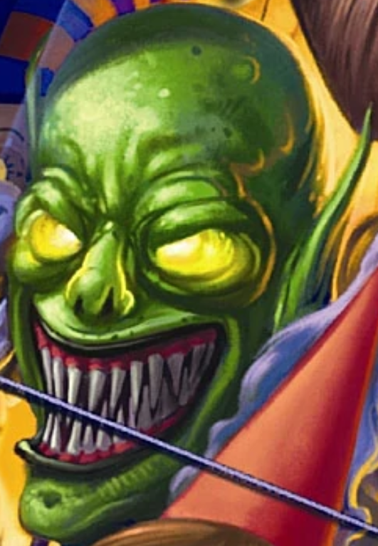 The book describes the mask as having yellow-green skin with a bulging, bald forehead. The eyes are a glowing orange, and the mouth is lined with rows of jagged animal fangs.